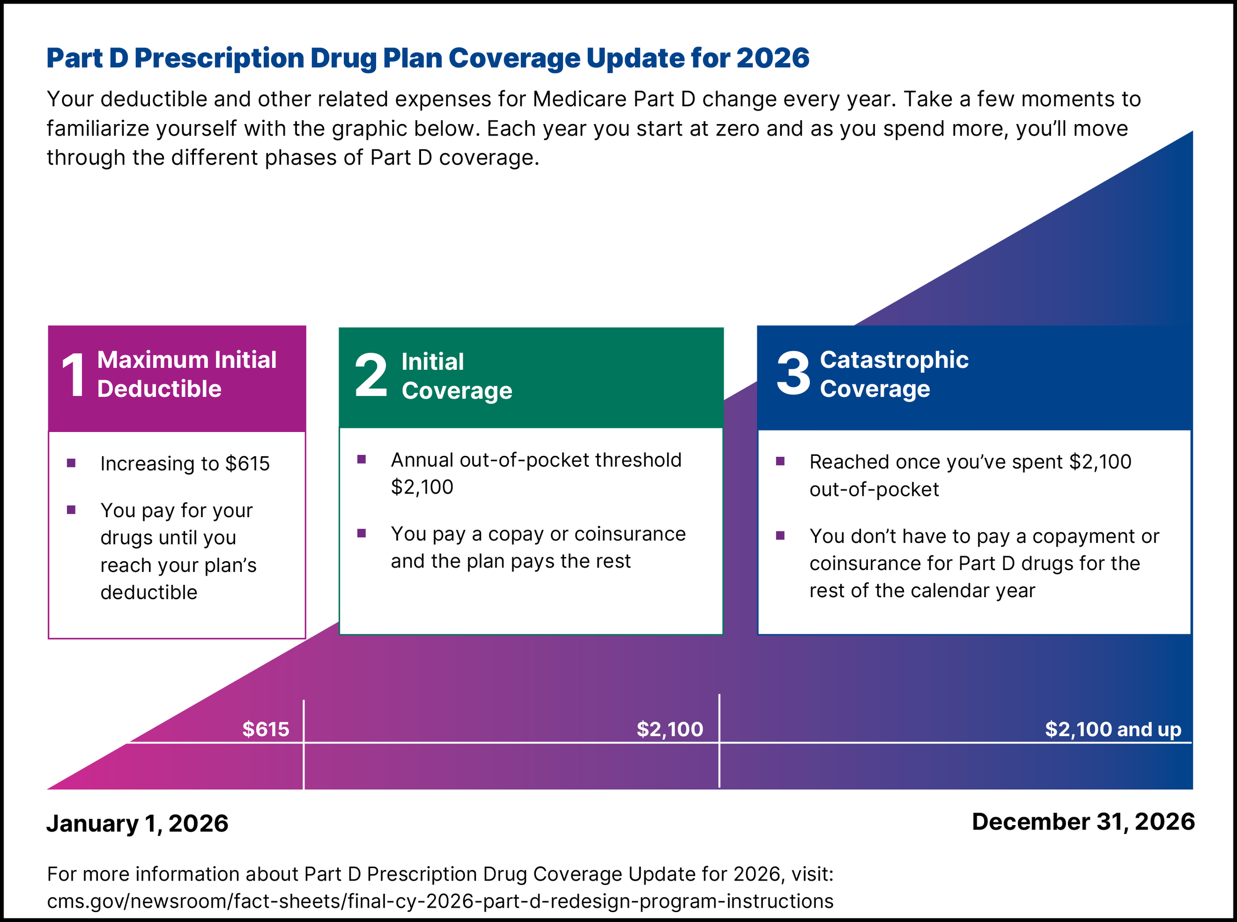 Once you spend $2,100 out-of-pocket in 2026, you enter the catastrophic coverage phase. You no longer have to pay a copayment or coinsurance for Part D drugs for the rest of the calendar year.