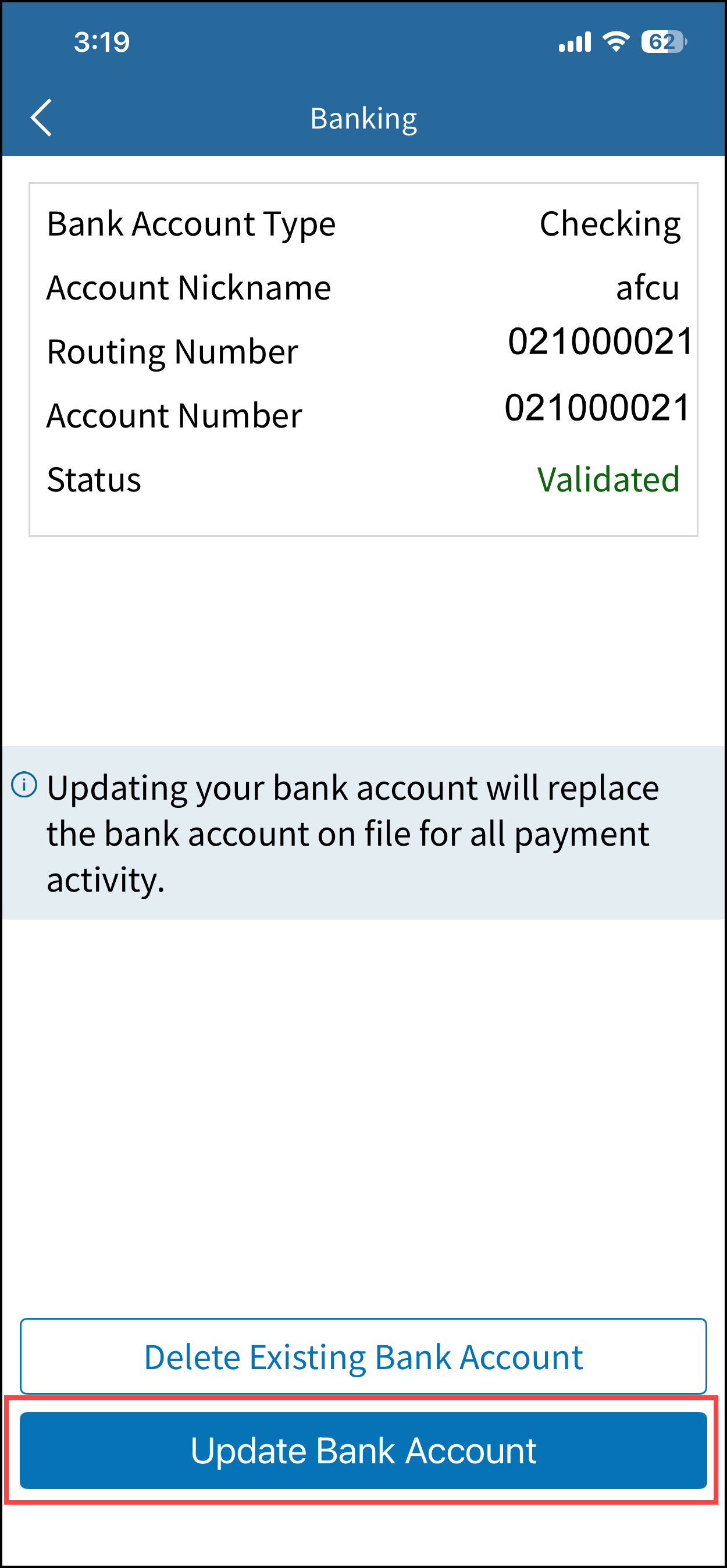 7. Select Update Bank Account. You’ll get a message saying your bank account is updated.
