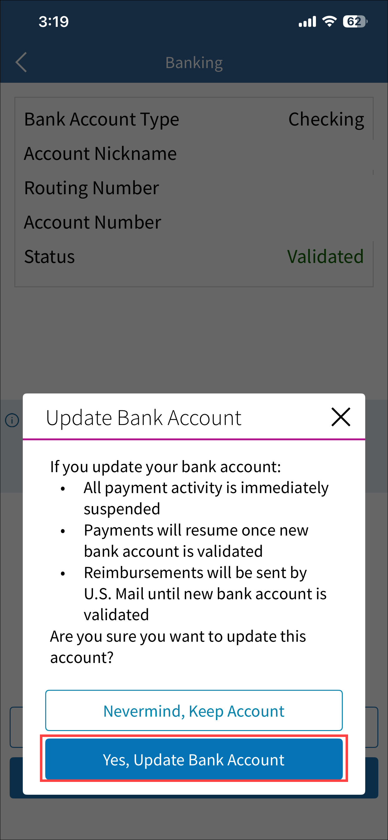5. Review the messages and select Yes, Update Bank Account to confirm you want to make an update.