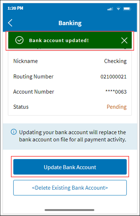 9. Select Update Bank Account. You’ll get a message saying your bank account is updated.