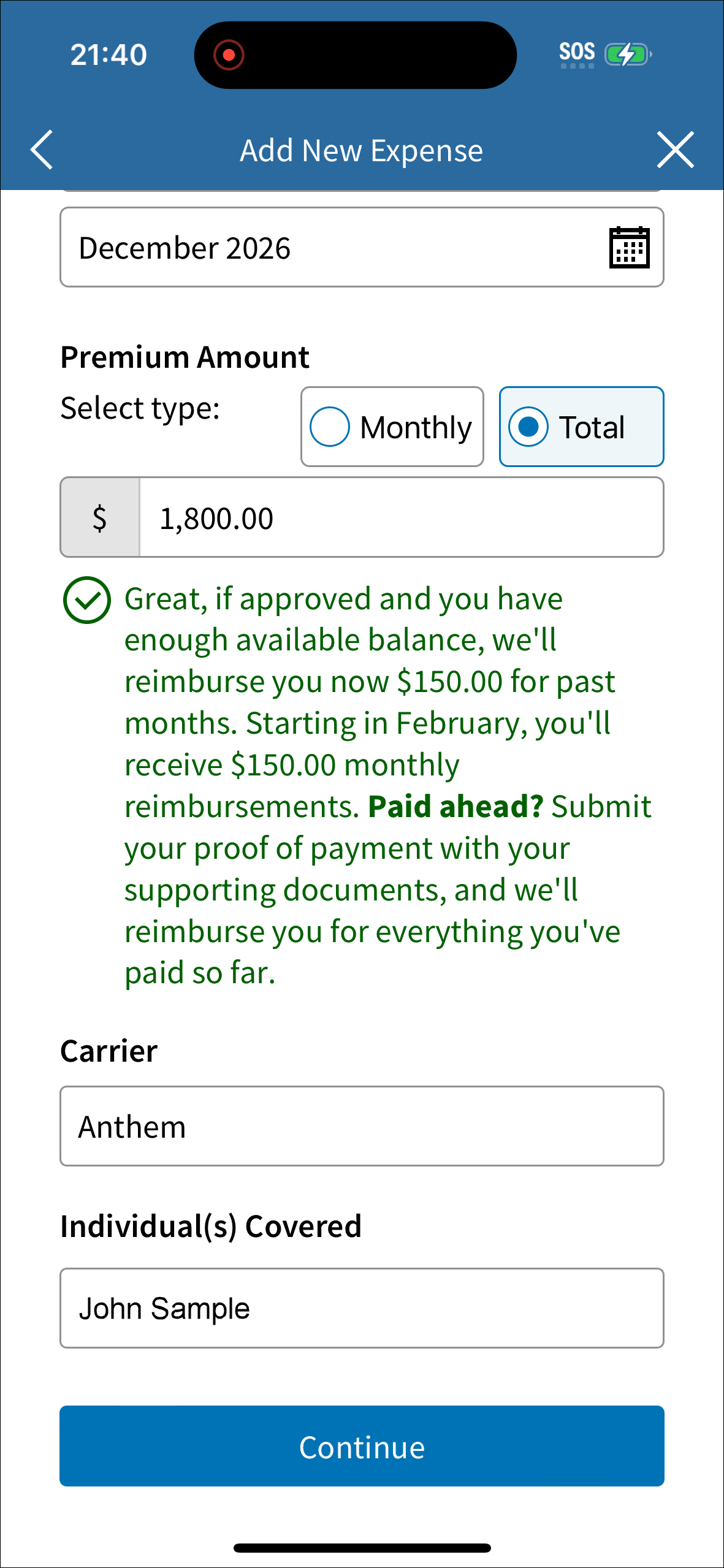 Note: Your former employer or benefits provider may provide premium reimbursement only. You will only see the options offered to you by your former employer. Your selection options adjust per your current account setup.