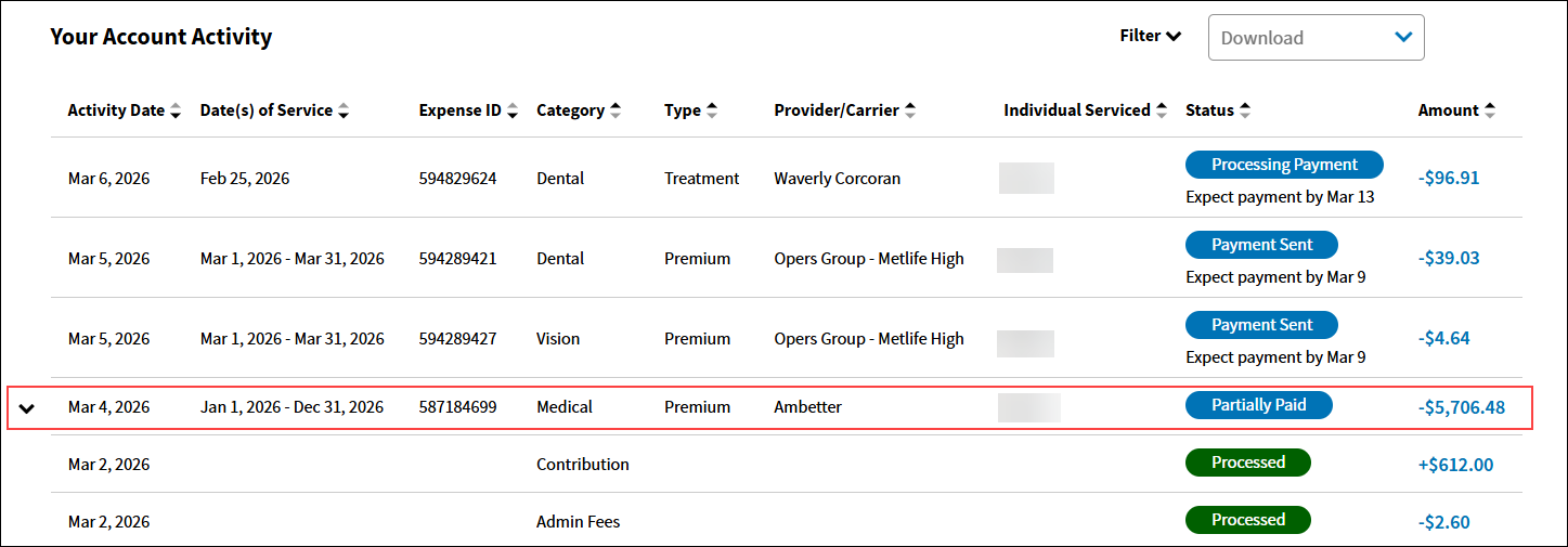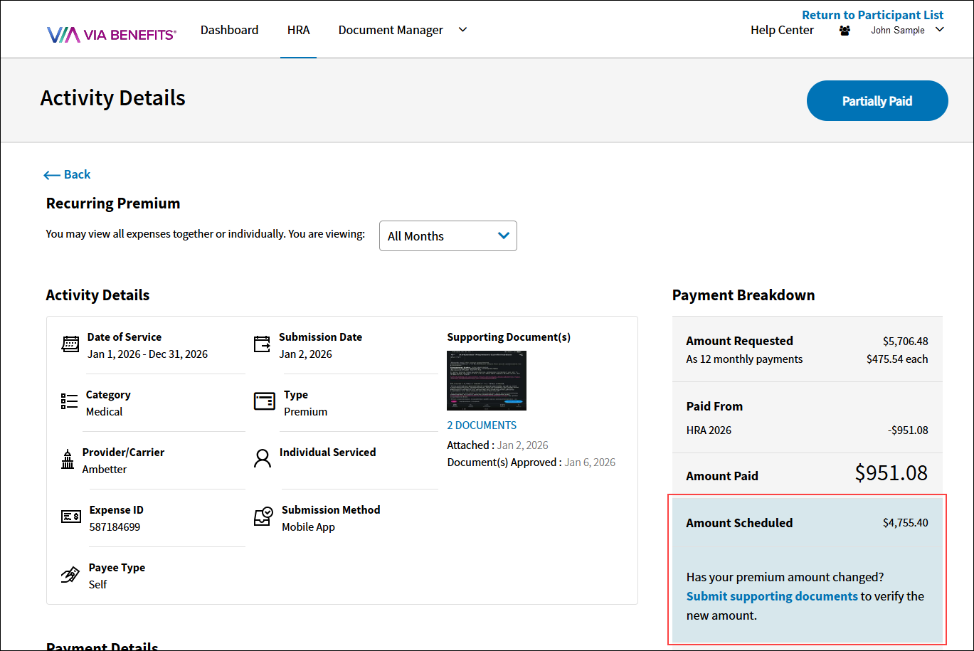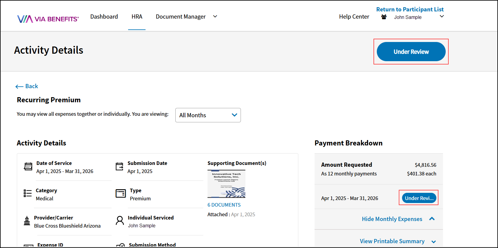 8. The Activity Details will display the expense as Under Review until the requested amount is approved. Once approved, the upcoming scheduled reimbursement amounts will reflect the updated premium.