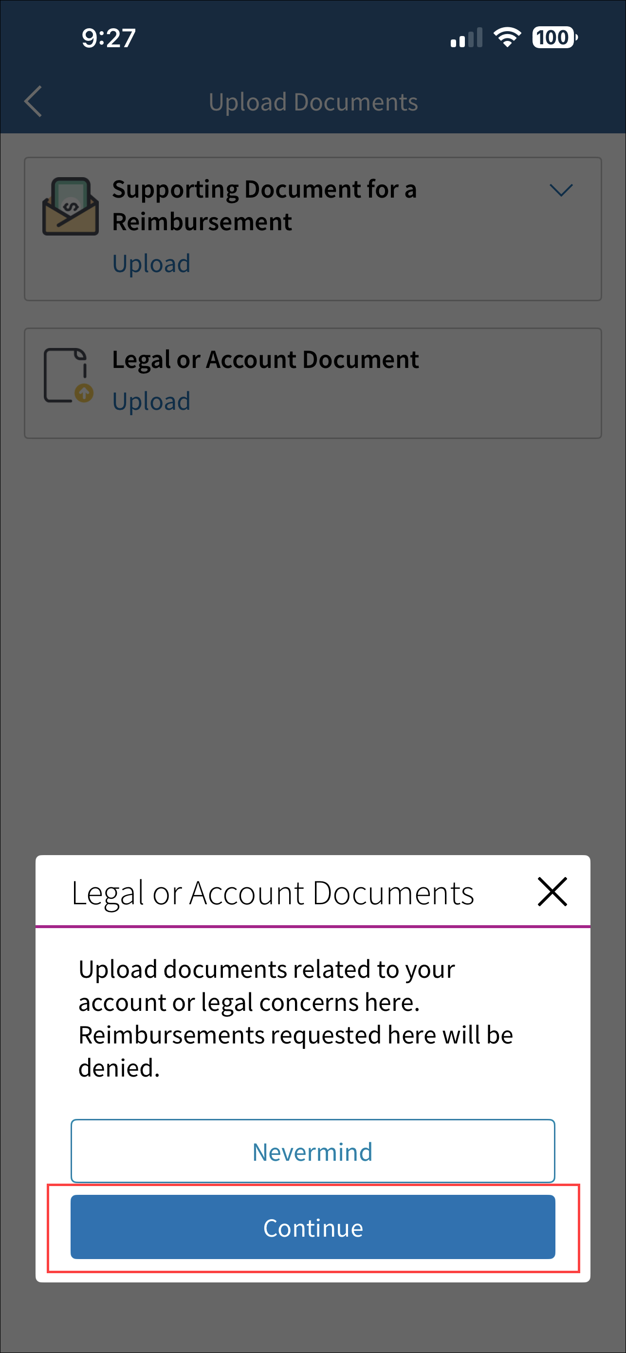 4. You’ll get a warning message stating to upload legal or account documents only. Select Continue.
